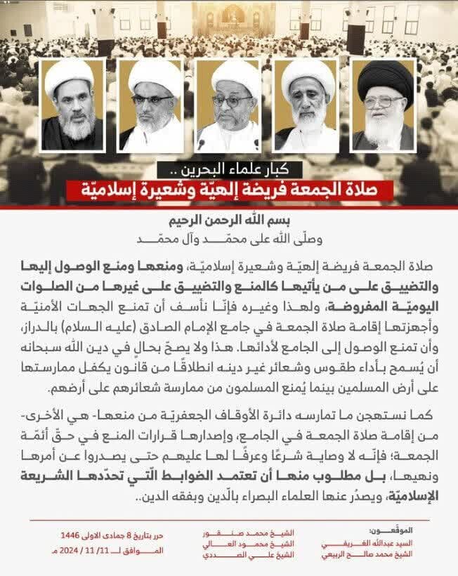 উল্লেখ্য যে, বাহরাইনের শিয়া অধ্যুষিত অঞ্চল আল-দারাজ ও ইমাম জাফর সাদিক (আ.) মসজিদের ধর্মপ্রাণ ও সচেতন মুসলমানেরা লেবাননের প্রতিরোধ সংগঠন হিজবুল্লাহর প্রধান শহীদ হাসান নাসরুল্লাহর প্রতি শ্রদ্ধা জানিয়ে শোকানুষ্ঠান, প্রতিরোধ যোদ্ধাদের প্রতি সমর্থন, ইহুদিবাদী দখলদার ইসরায়েলের সঙ্গে বাহরাইনের সম্পর্কের অবসান ও ইহুদিবাদী রাষ্ট্রের রাষ্ট্রদূতকে বাহরাইন থেকে অব্যাহতি দেয়ার দাবী তুললে ইহুদি ও পশ্চিমাদের দোসর আলে খলিফা শাসকগোষ্ঠী জুমার নামাজ ও যেকোনো সমাবেশের ওপর এই নিষেধাজ্ঞা আরোপ করে।