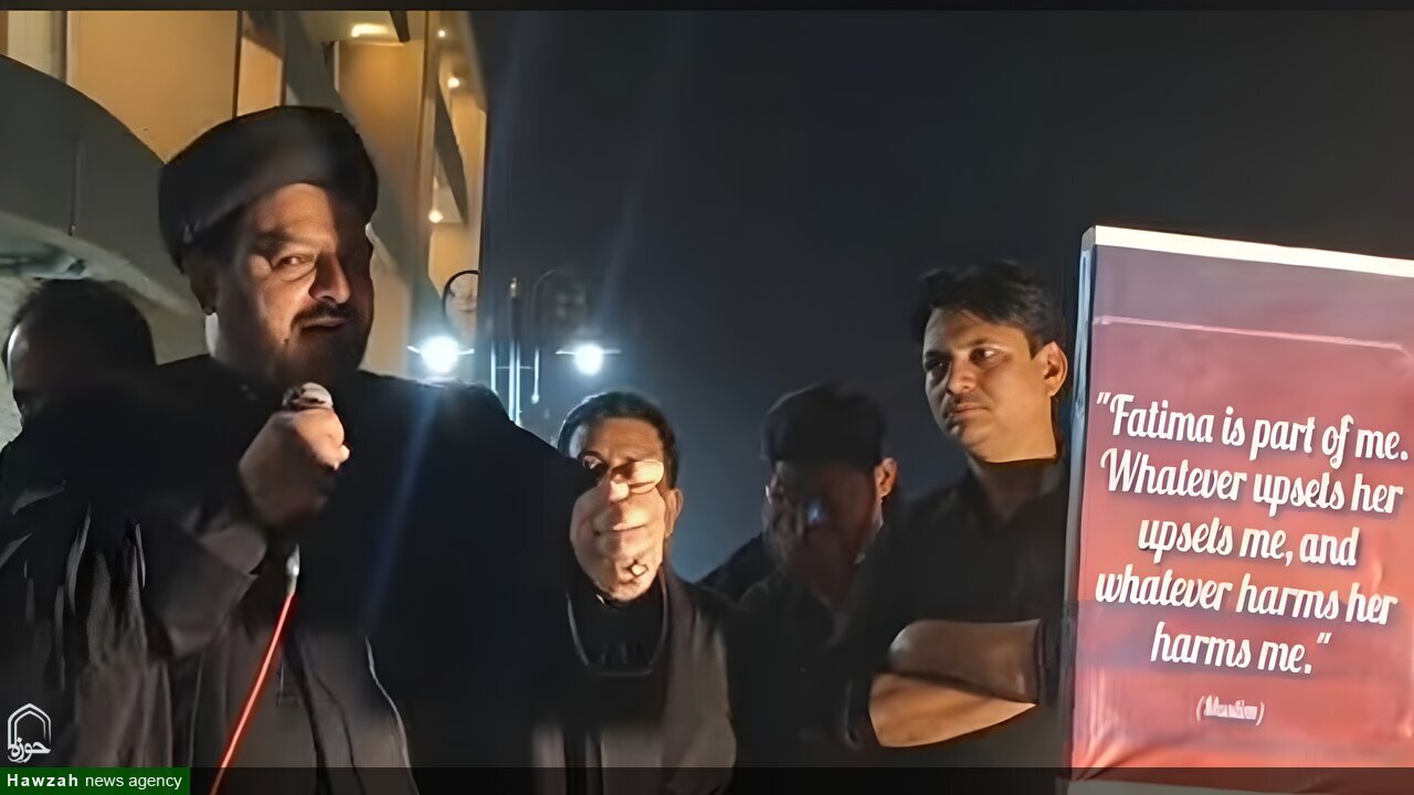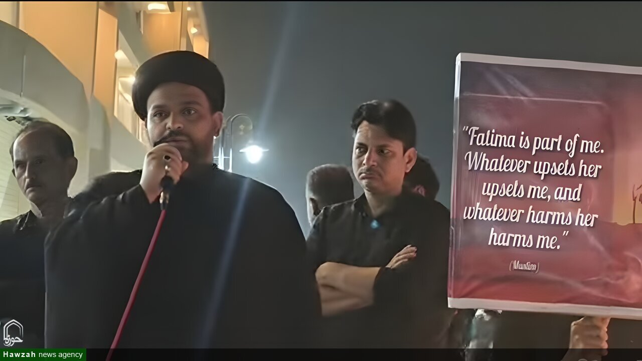 শোকযাত্রায় হাওজা নিউজ এজেন্সি–উর্দুর প্রধান সম্পাদক হুজ্জাতুল ইসলাম ওয়াল মুসলিমিন মাওলানা সাইয়্যিদ মাহমুদ হাসান রিজভী বক্তব্য রাখেন। তিনি সাইয়্যিদা ফাতিমা (সা.আ.)–এর জীবনী, তাঁদের যন্ত্রণাদায়ক ঘটনা এবং উম্মতের ঐতিহাসিক প্রশ্নসমূহ নিয়ে বলেন: আজ আমি সকল মুসলমানের কাছে একটি প্রশ্ন রাখতে চাই… সেই নবী (সা.)–এর কন্যা, যাঁর সম্মানে আকাশও নত হতো—