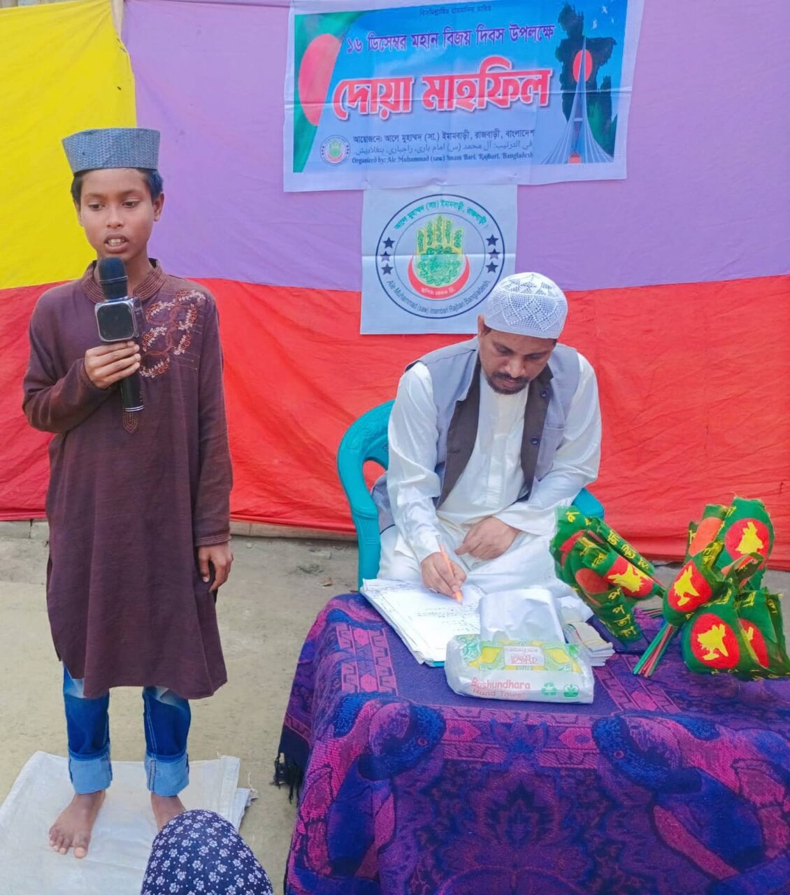হাওজা নিউজ এজেন্সি রিপোর্ট অনুযায়ী, মহান বিজয় দিবস উপলক্ষে আলে মুহাম্মদ (সা.) ইমামবাড়ী রাজবাড়ীতে পবিত্র কুরআন তেলাওয়াত শিক্ষা ক্লাসের ছাত্র-ছাত্রীদের অংশগ্রহণে পবিত্র কুরআন তেলাওয়াত, দোয়া মাহফিল এবং শারীরিক চর্চাভিত্তিক খেলাধুলার আয়োজন করা হয়।